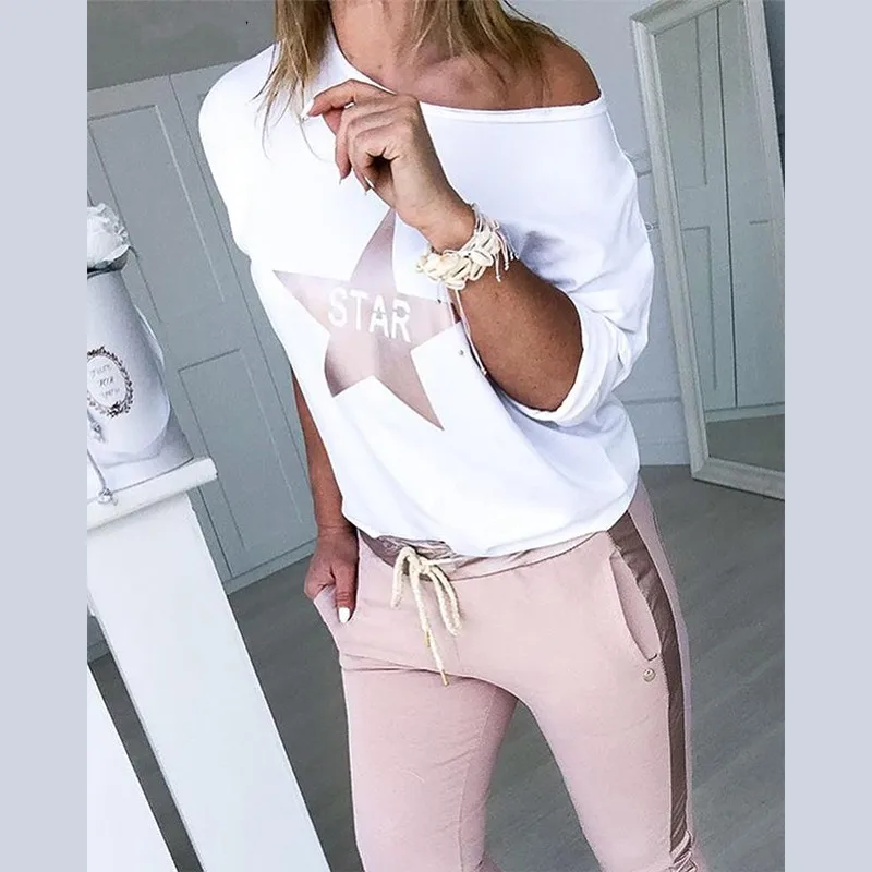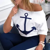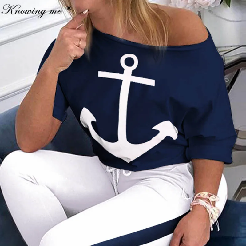 Women Spring sexy off shoulder Tracksuit sets Lady Boat Anchor Print tops Two Piece Set Female Elastic Waist Long Pants Sets